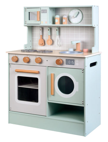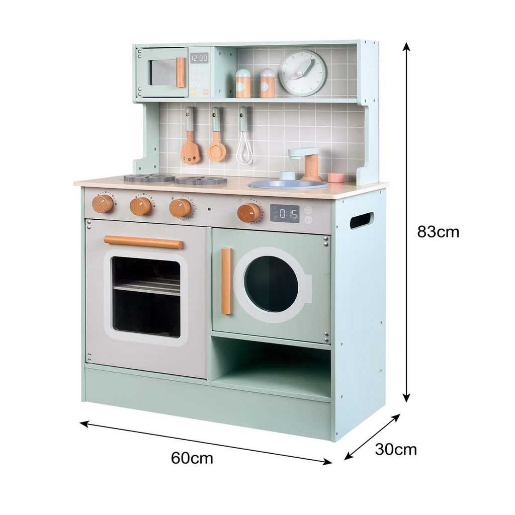 Inspire culinary creativity and hours of imaginative play with the beautifully crafted Chef's Kitchen! Designed with charming modern aesthetic and soft pastel tones, this wooden play kitchen is a stylish and functional addition to any playroom.